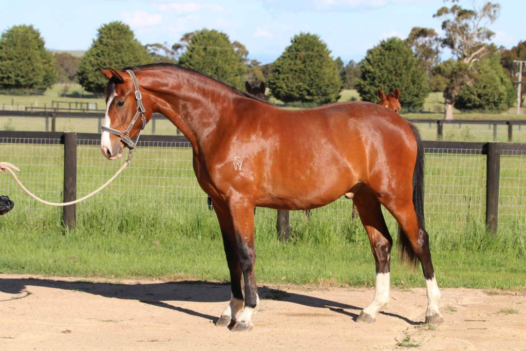 From our outstanding temperament produce Finess (IMP) (Argentinus x Sandro Hit), Santiago is an exceptional bright bay colt. He has 3 excellent paces, long elegant lines, an exceptional temperament consistent with this mare’s other offspring, and is blessed with lots of white.