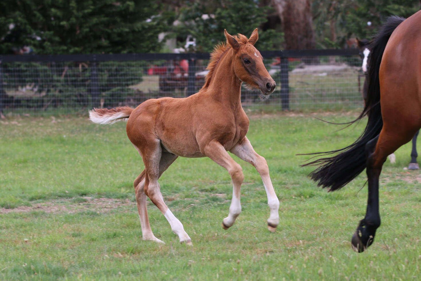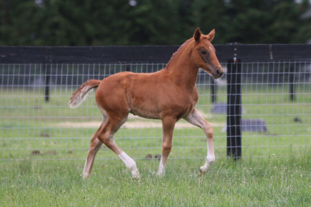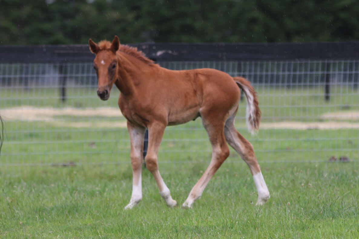 A well developed and enchanting chestnut filly gifted with all the attributes to make an excellent riding horse. Her walk has a large over track, her trot has plenty of elasticity with excellent rhythm, and her canter has plenty of jump and natural balance.